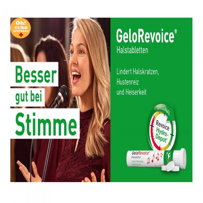 많은 직업에서 목소리는 가장 중요한 작업 도구입니다. 하지만 장시간 말하면 인후통, 기침, 쉰 목소리가 생길 수 있습니다. 교사, 영업사원, 교육자 등 말이 많은 사람들은 GeloRevoice® 를 사용하면 급성 질환에도 목소리를 더 잘 유지할 수 있습니다.특별한 Revoice Hydro-Depot 은 건조하고 자극받은 입과 목의 점막에 보호막을 형성합니다. 인후통, 기침, 쉰 목소리가 완화됩니다.