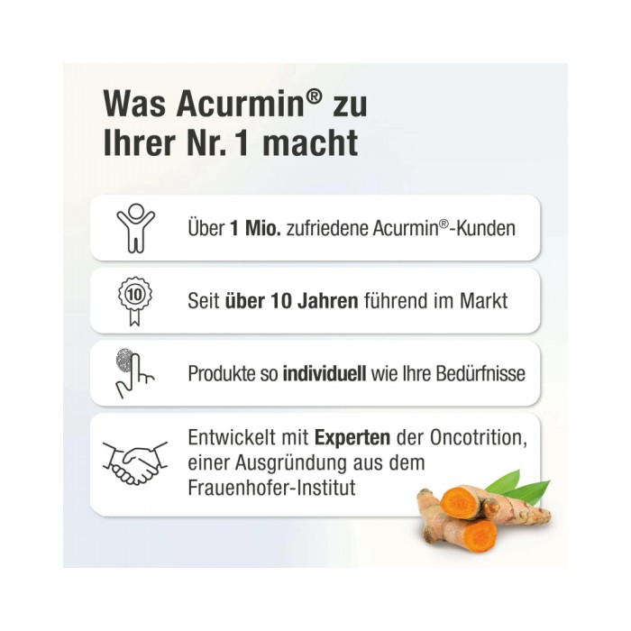 Acurmin Plus는 혈액 내 커큐민 수치를 영구적으로 증가시키고 안정적으로 유지하는 데 처음으로 성공했습니다. Acurmin Plus를 더 오래 섭취하지 않아도 커큐민 미러는 오랫동안 증가한 상태를 유지합니다.