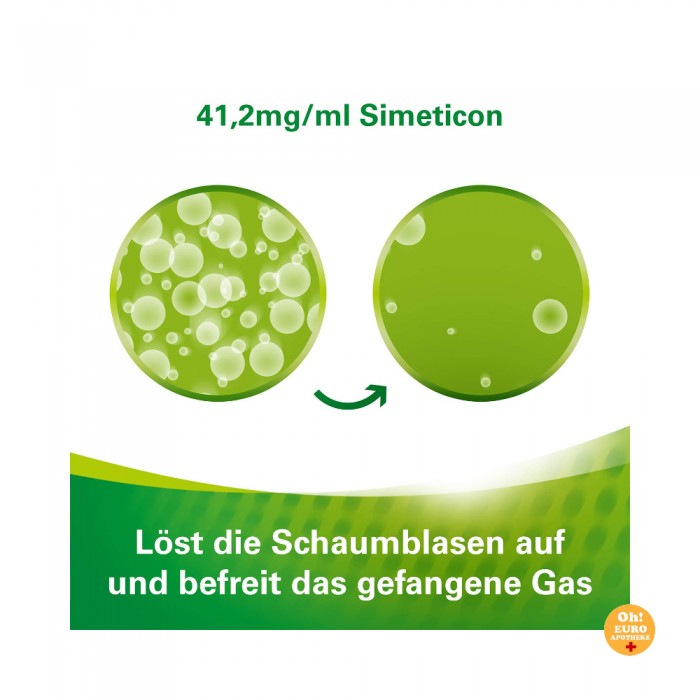 매우 잘 견디는 특성: 활성 성분인 시메티콘은 위와 장에서 순전히 물리적으로 국소적으로 작용하며 신체에서 혈류로 흡수되지 않습니다. 실용적인 투여 펌프 덕분에 취급이 안전하고 정확하며 쉽습니다. 귀찮은 물방울 계산이 없습니다.
