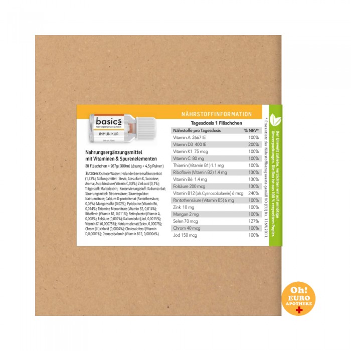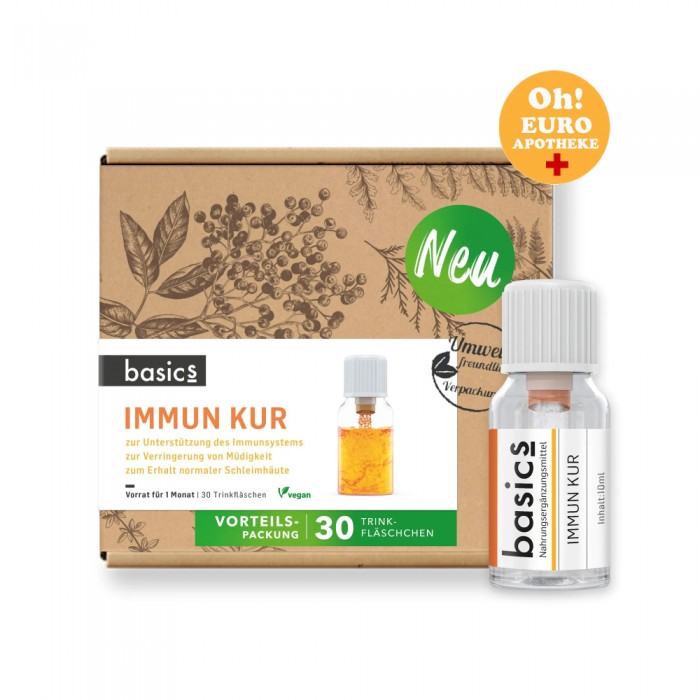 기본 IMMUN KUR는 특히 겨울철이나 스트레스가 많은 시기에 면역 체계를 지원하고, 신체에 15가지 미량 영양소를 안정적으로 공급합니다 . 에너지 대사를 촉진하고, 세포를 보호하고 정상적인 점막을 유지하는 데 도움이 됩니다.