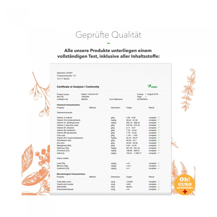 비타민 B2, C, 셀레늄 , 아연은 산화 스트레스로부터 세포를 보호하는 데 도움이 되며, 이는 스트레스가 증가할 때 특히 중요합니다. 또한, 비타민 B2는 정상적인 점막을 유지하는 데에도 도움이 됩니다.기본 IMMUN KUR는 장기간 사용에도 이상적입니다. 예를 들어 운동선수, 노인, 비타민 B 복합제가 더많이 필요한 사람들에게 적합합니다.