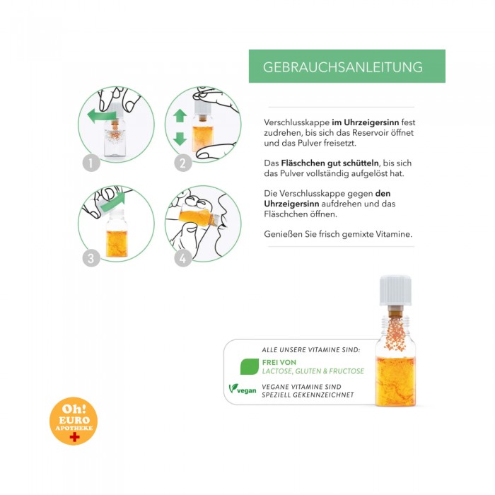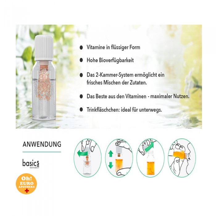 권장 복용량: 매일 1병. 1단계 화살표 방향으로 캡을 오른쪽으로 돌립니다. 영양실이 열리고 영양분 분말이 방출됩니다. 2단계 영양분이 완전히 녹을 때까지 병을 잘 흔듭니다. 귀중한 성분이 액체에 흡수됩니다. 신선한 조제 덕분에 물질이 조기에 분해되지 않습니다. 모든 성분이 신체에 완벽하게 보존됩니다. 3단계 이제 액체를 마실 준비가 되었습니다. 화살표 방향에 반하여 캡을 왼쪽으로 돌리고 액체를 마십니다.