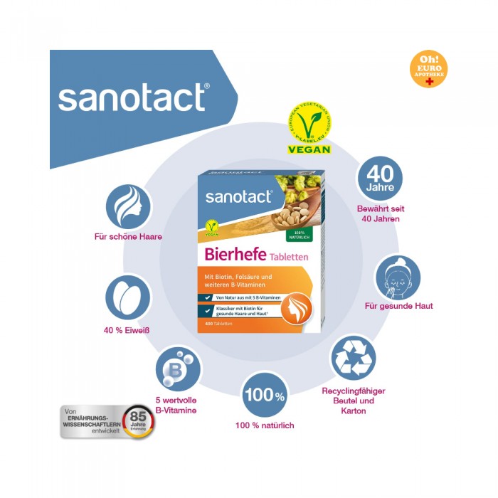 사노택트 맥주 효모 정제는 피부와 머리카락에 대한 식이 보충제로 사용되는 고품질의 100% 천연 제품입니다.