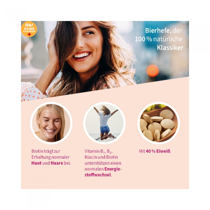천연 양조 효모 정제는 35년 이상 뷰티 클래식으로 입증되었습니다. 양조 효모는 비타민의 진정한 보물입니다. 따라서 여러 세대에 걸쳐 많은 여성에게 아름다운 피부와 머리카락의 비결로 여겨져 왔습니다. 양조 효모는 비타민 B1(티아민) 함량이 가장 높은 천연 제품 중 하나이며 다른 중요한 B 비타민의 천연 공급원이기도 합니다.