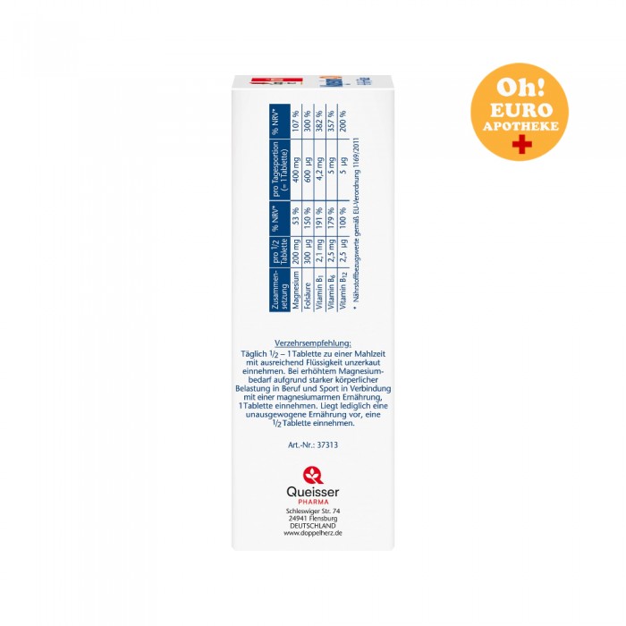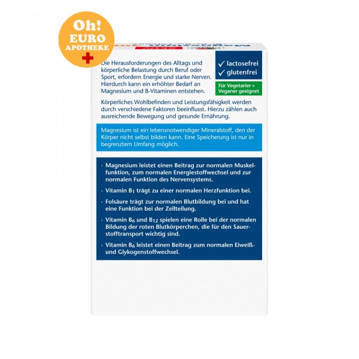 신체적 스트레스와 일과 스포츠를 포함한 도전적인 일상 생활은 신체에서 에너지, 근력, 신경을 요구합니다. 신체의 웰빙과 성능은 또한 비타민과 미네랄의 최적 공급에 달려 있습니다. 미네랄 마그네슘은 신체 자체에서 생성할 수 없고 제한된 양으로만 저장될 수 있으므로 신체에 공급해야 하지만 필수 영양소입니다. 오늘날 음식을 통해 섭취하는 마그네슘의 양은 식품 가공의 정도가 높고 식품 준비 시 손실이 발생하기 때문에 항상 최적이 아닙니다. Doppelherz Magnesium 400은 마그네슘 외에도 중요한 B 복합 비타민(B1, B6, B12)과 엽산을 제공합니다.