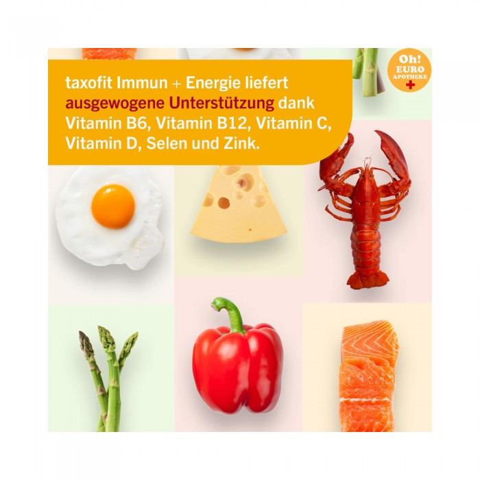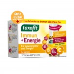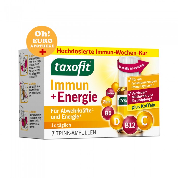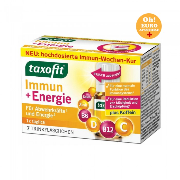 Taxofit Immune + Energy 음료병에는 검증된 비타민 C, D, B12, B6와 미네랄인 아연, 셀레늄이 특별히 조합되어 들어 있습니다.