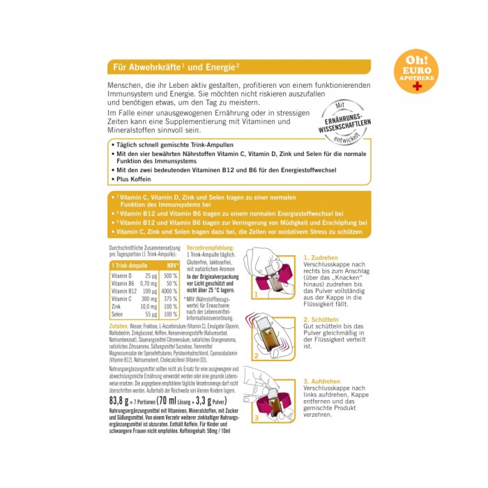 성분 :물, 과당, L-아스코르브산(비타민 C), 유화제 글리세린, 말토덱스트린, 글루콘산 아연, 카페인, 방부제(소르빈산 칼륨, 벤조산나트륨), 산성화제 구연산, 천연 오렌지 향, 천연 감귤 향, 감미료 수크랄로스, 덩어리 형성 방지제 지방산 마그네슘 염, 피리독신 염산염, 시아노코발라민(비타민 B12), 셀레나이트나트륨, 콜레칼시페롤(비타민 D3).