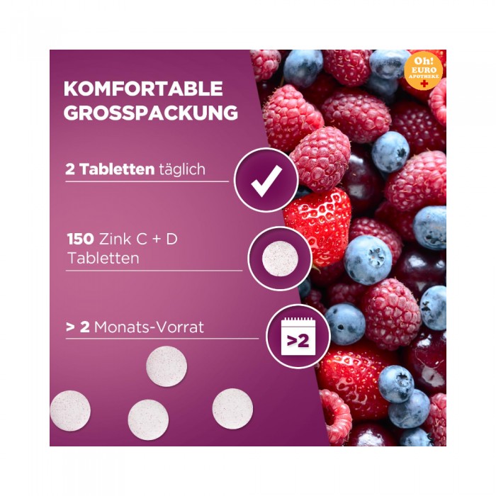 - 면역 체계를 위해 아연, 비타민 C, D3는 면역 체계의 정상적인 기능과 감기에 대한 보호에 도움이 됩니다.