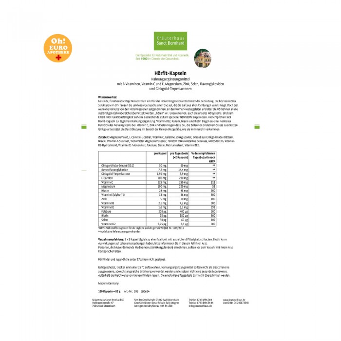 청각 기관을 포함한 우리의 신경은 기능을 유지하기 위해 특별한 영양소의 충분한 공급에 의존합니다. 여기에서는 Hörfit 캡슐을 매일의 건강 보조 식품으로 권장하고 있습니다. 비타민 B12, 니아신, 비오틴은 신경계의 정상적인 기능에 기여합니다. 비타민 C, 아연, 셀레늄은 세포를 산화 스트레스로부터 보호하는 데 도움이 됩니다. 은행나무는 내이에 있는 작은 혈관의 혈액 순환을 돕습니다.