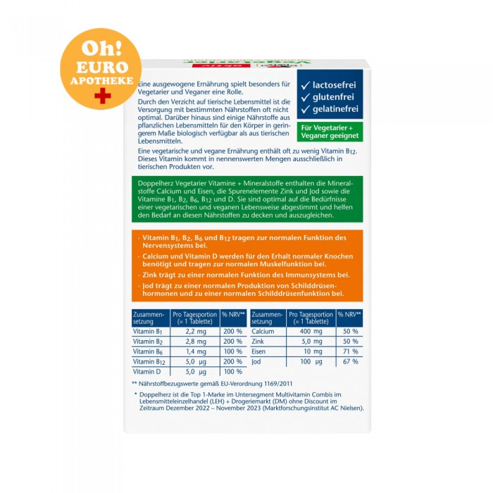 - Doppelherz 채식 비타민과 미네랄은 채식주의와 비건 식단의 요구 사항에 최적으로 맞춰져 있습니다.