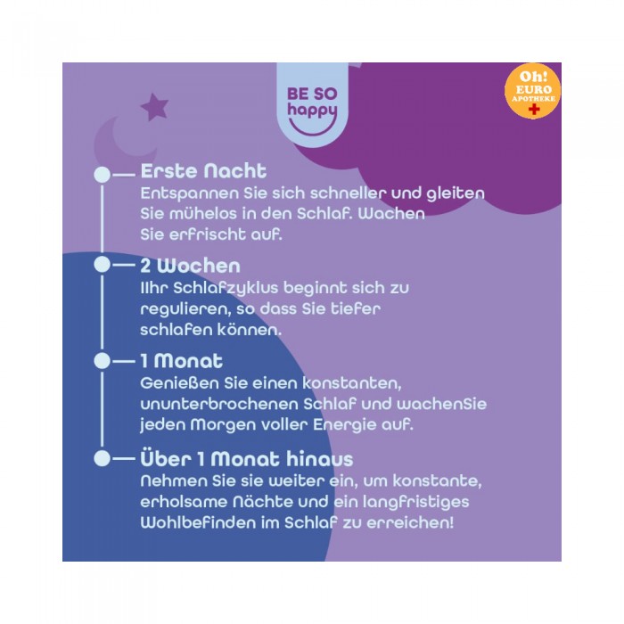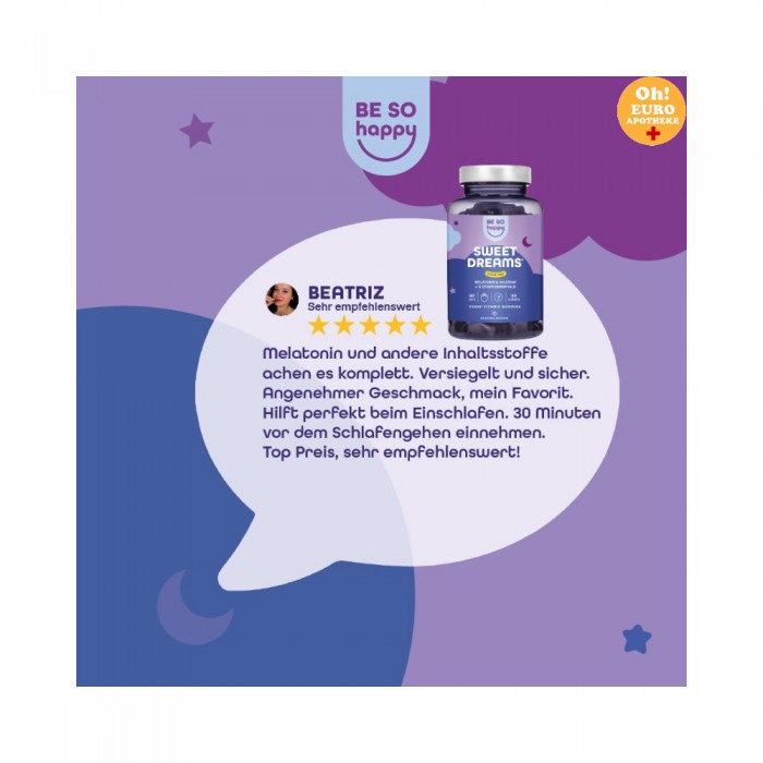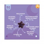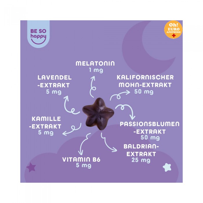 성분: 감미료(말티톨 시럽 및 스테비올 배당체), 변성 전분, 산미제(사과산 및 구연산), 산도 조절제(구연산나트륨), 천연 향료, 발레리안 추출물, 색소(당근 농축액), 밤 추출물, 코팅제(카르나우바 왁스), 멜라토닌, 라벤더 추출물.