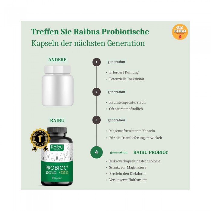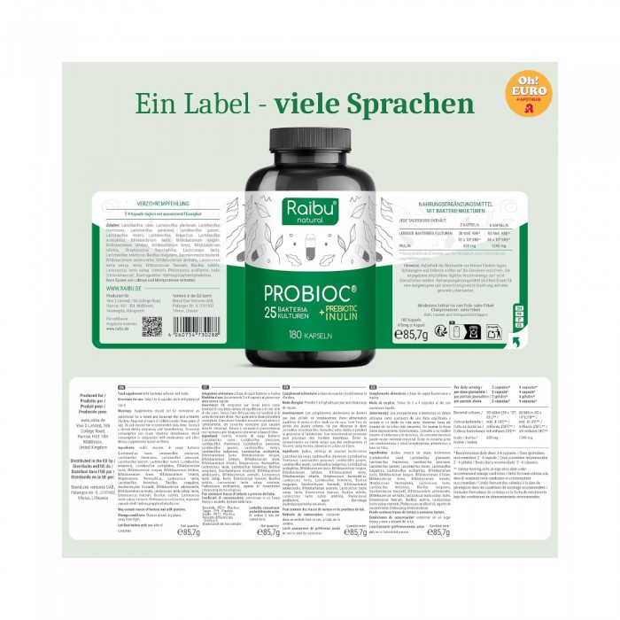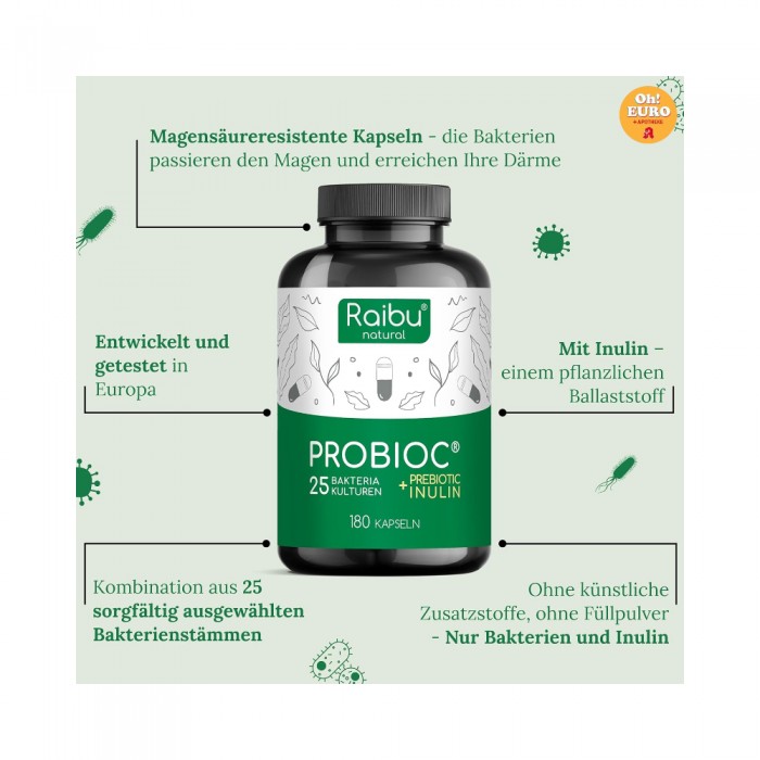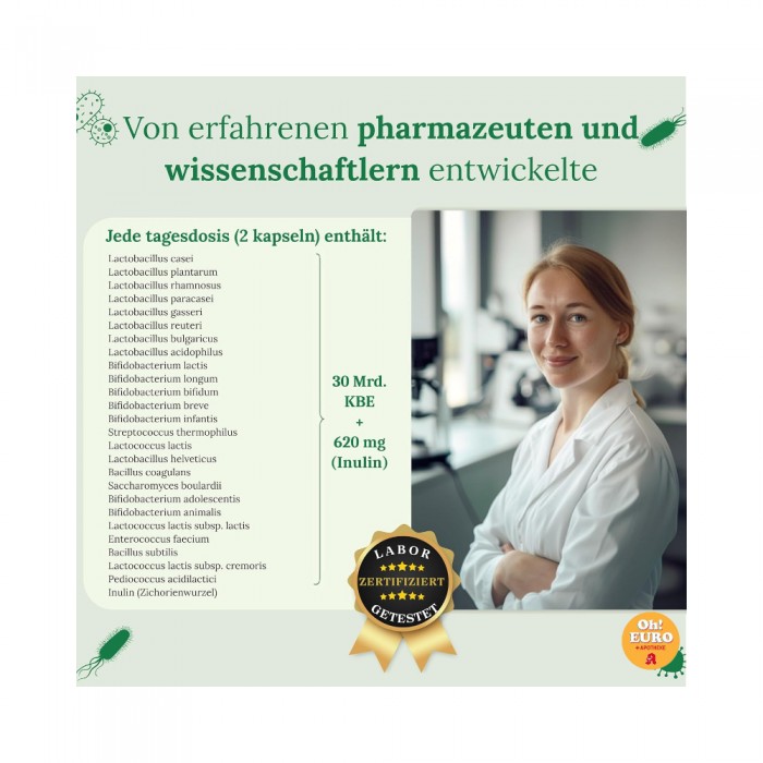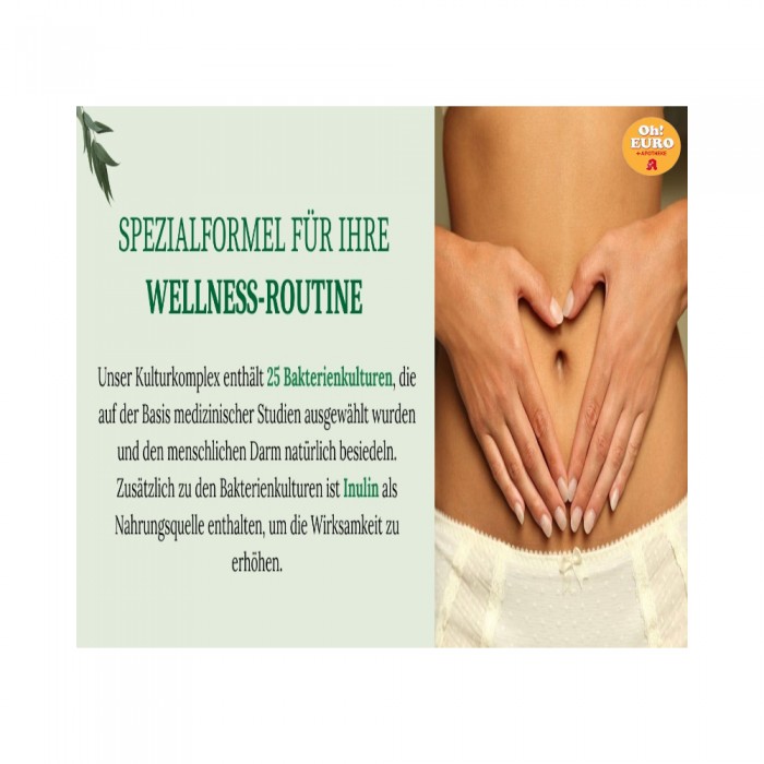 성분 : 락토바실러스 카세이, 락토바실러스 플란타룸, 락토바실러스 람노서스, 락토바실러스 가세리, 락토바실러스 파라카세이, 락토바실러스 루테리, 락토바실루스 불가리쿠스, 락토바실러스 애시도필루스, 비피도박테리움 락티스, 비피도박테리움 롱검, 비피도박테리움 비피덤, 비피도박테리움 브레브, 비피도박테리움 인판티스, 연쇄구균 써모필루스, 락토코커스 락티스, 락토바실러스 헬베티쿠스, 바실러스 코아귤란스, 사카로마이세스 보울라디, 비피도박테리움 청소년, 비피도박테리움 아니말리스, 락토코커스. 락티스는 하위종이다. 락티스, 엔테로코커스 패칼리스, 바실루스 서브틸리스, 락토코커스 락티스 subsp. 크레모리스, 페디오코쿠스 아시딜락티시, 이눌린, 코팅제: 히드록시프로필메틸셀룰로오스.