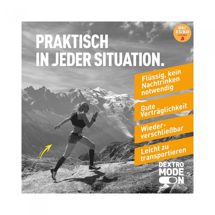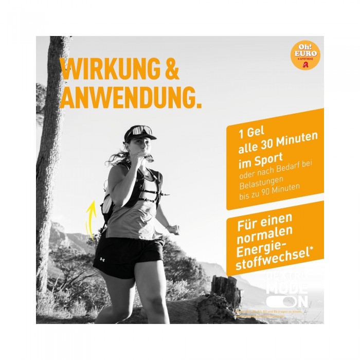 제품 구성 및 사용 권장 사항 : 1회 제공량에는 60ml 용량의 DEXTRO ENERGY 액상 젤 18개가 들어 있습니다. 30분마다 1포(60ml)씩 또는 최대 90분까지 활동 시 필요에 따라 섭취하십시오. 스포츠 활동 중 사용 가능합니다.