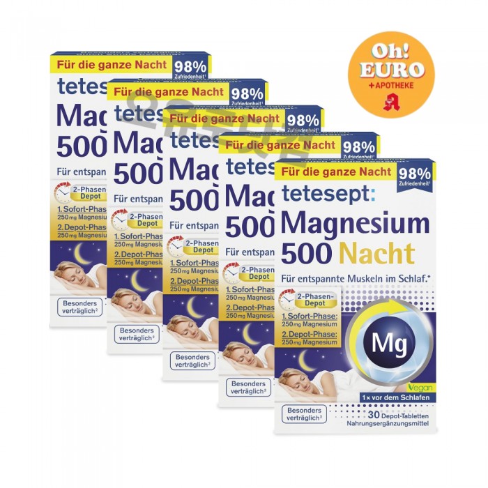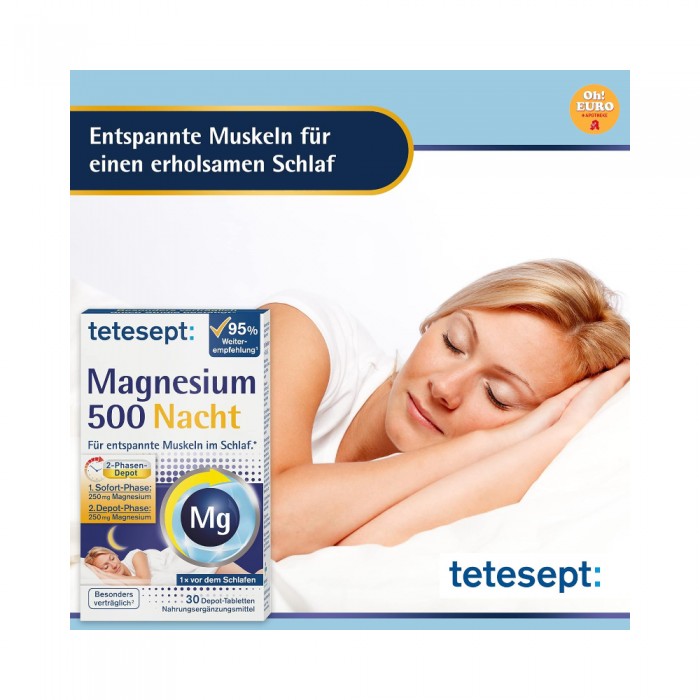 이완된 근육을 위해: 테테셉트 마그네슘 나이트 500 비타민 정제는 정상적인 근육 기능과 신경계의 정상적인 기능에 도움이 됩니다.