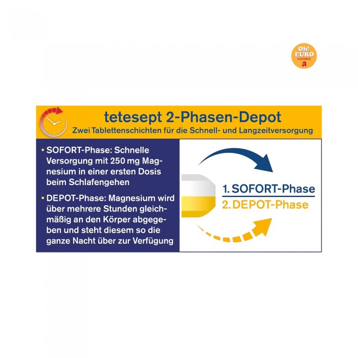 밤새도록 작용합니다 : 비타민 정제의 저장 단계에서는 마그네슘이 몇 시간에 걸쳐 신체에 고르게 방출되므로 밤새도록 신체가 이용할 수 있습니다.